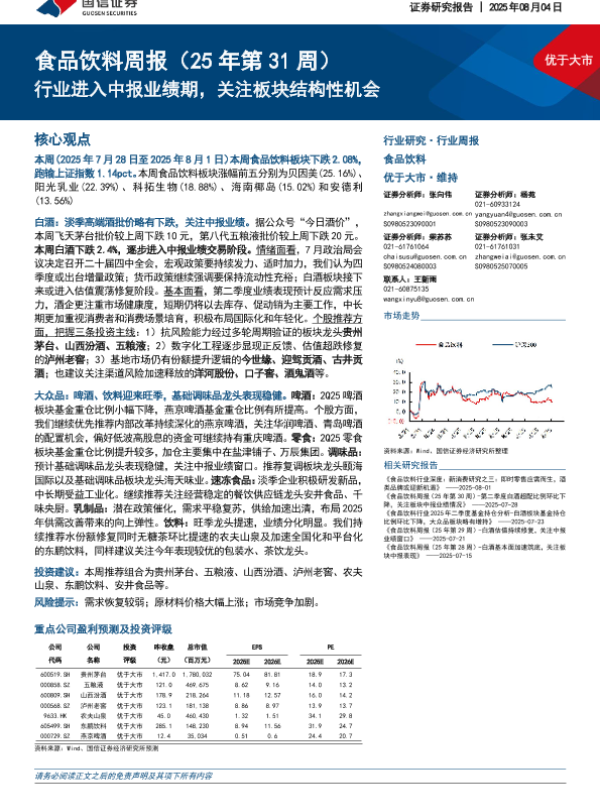 【国信证券GUO XIN SECURITIES】【20250804】食品饮料行业周报(25年第31周)-行业进入中报业绩期,关注板块结构性机会-16页