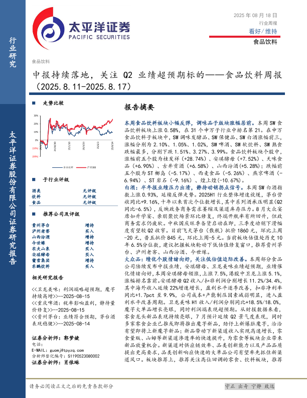 【太平洋证券】【20250818】食品饮料行业周报-中报持续落地,关注Q2业绩超预期标的-10页