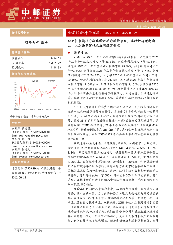 【中邮证券】【20250825】食品饮料行业周报:白酒报表端压力加速释放助力股价表现-宠物经济蓬勃向上-大众品多家报表展现经营亮点-19页