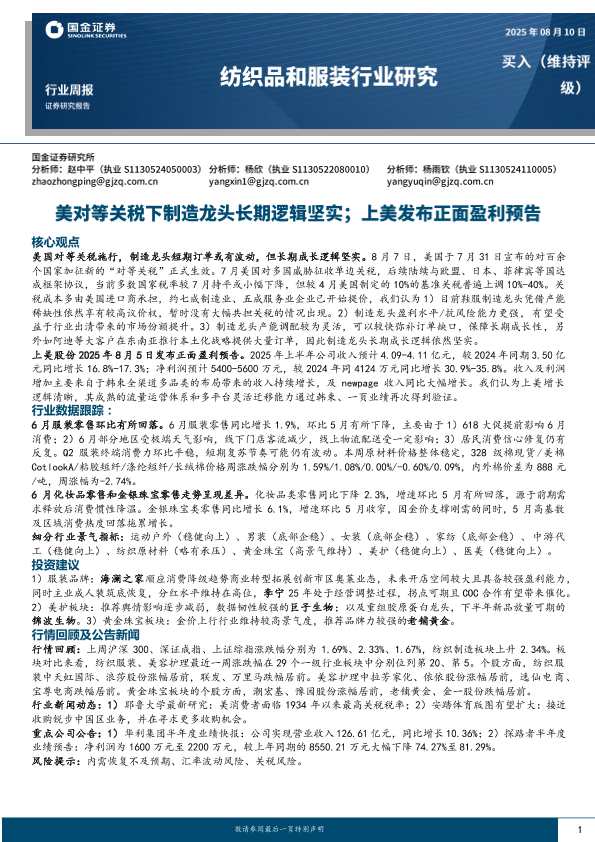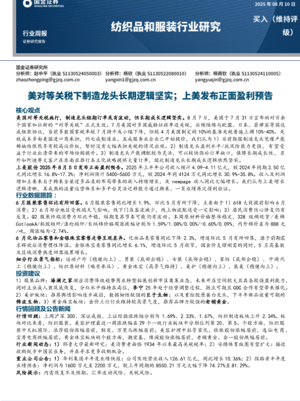 关税 上美股份 制造龙头 服装行业 纺织品