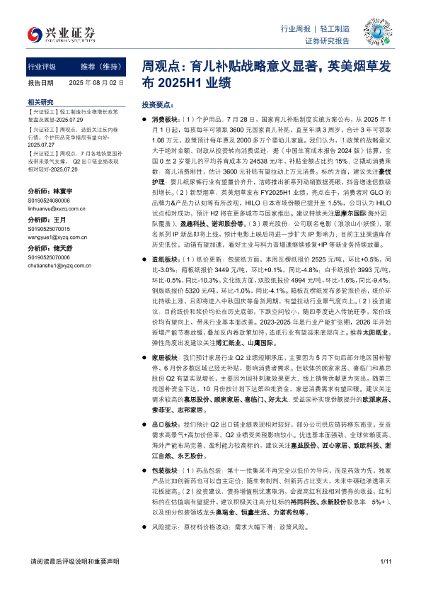 【兴业证券】【20250802】育儿补贴战略意义显著-英美烟草发布2025H1业绩-11页