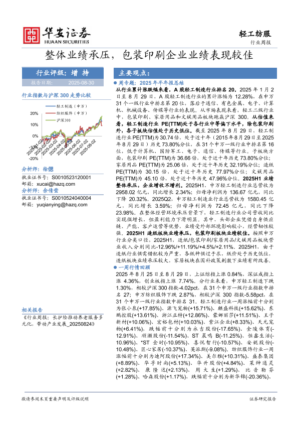 【华安证券】【20250830】轻工纺服行业周报:整体业绩承压,包装印刷企业业绩表现较佳-27页
