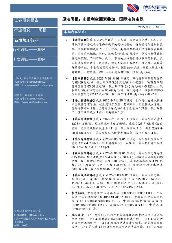 【信达证券】【20250810】原油周报:多重利空因素叠加,国际油价走跌-26页