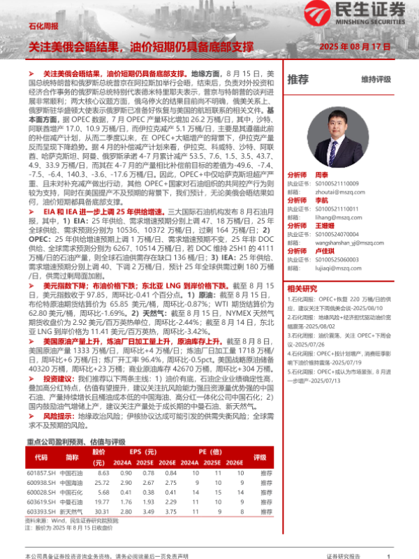 【民生证券】【20250817】石化周报:关注美俄会晤结果,油价短期仍具备底部支撑-29页