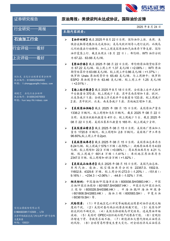 【信达证券股份有限公司CINDA SECU RITIES CO.<D】【20250824】原油周报:美俄谈判未达成协议,国际油价反弹-26页