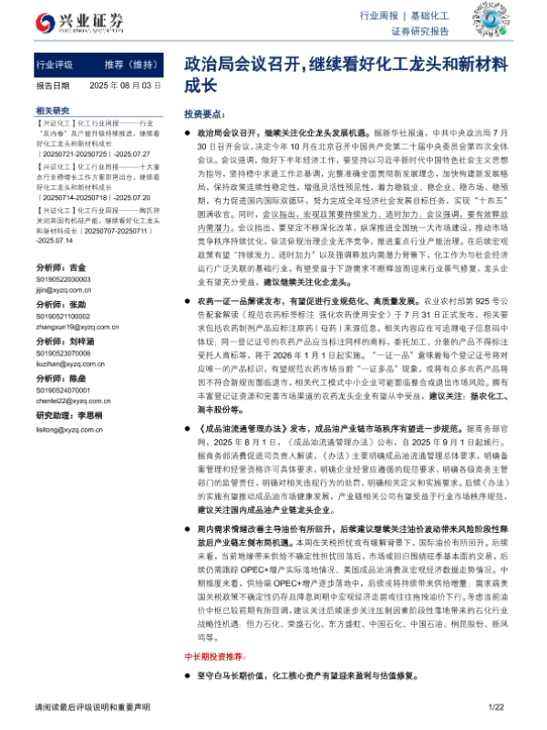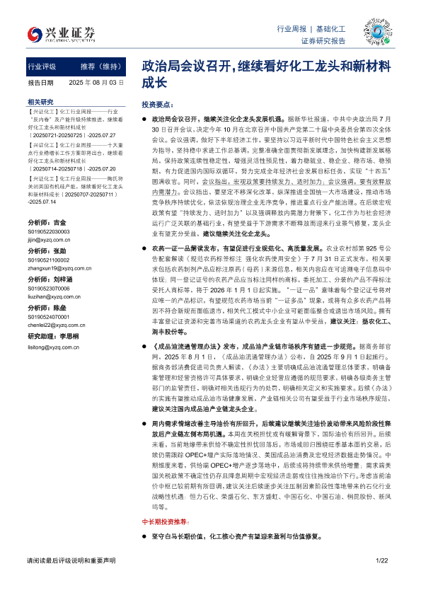 【兴业证券】【20250803】政治局会议召开,继续看好化工龙头和新材料成长-22页
