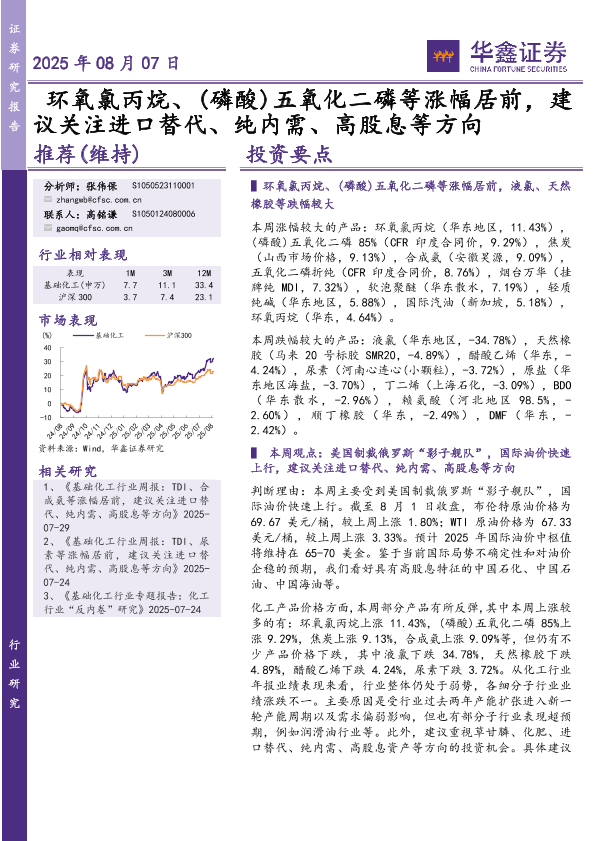 【华鑫证券】【20250807】环氧氯丙烷、(磷酸)五氧化二磷等涨幅居前,建议关注进口替代、纯内需、高股息等方向-32页