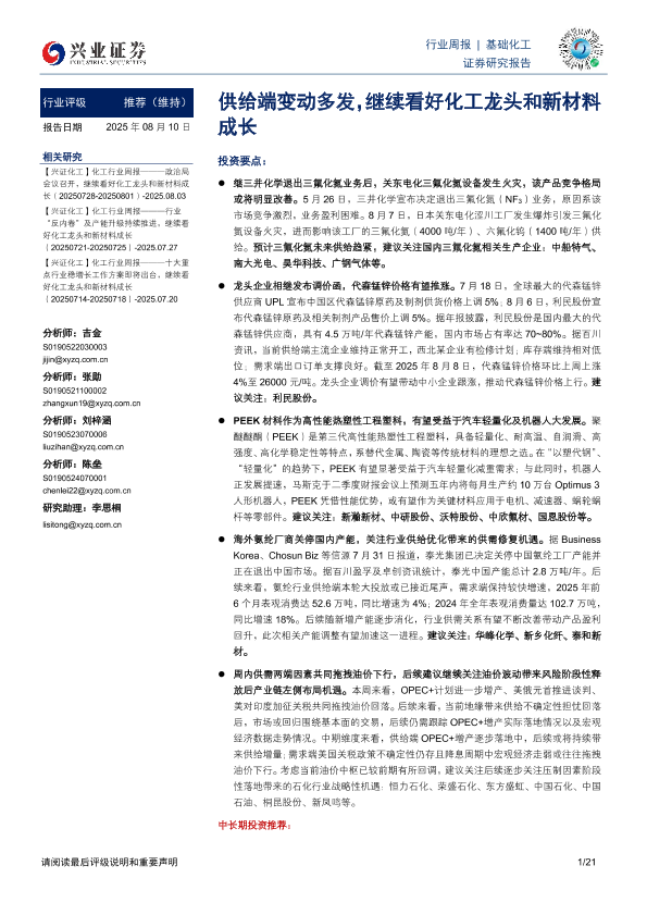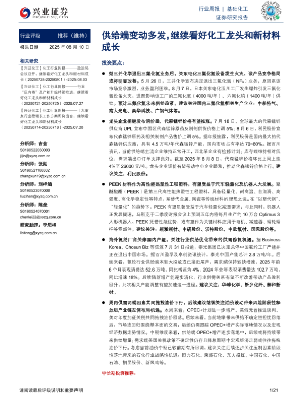 【兴业证券】【20250810】基础化工行业周报:供给端变动多发,继续看好化工龙头和新材料成长-21页
