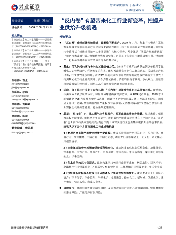 【兴业证券】【20250813】基础化工行业深度报告:“反内卷”有望带来化工行业新变革,把握产业供给升级机遇-25页