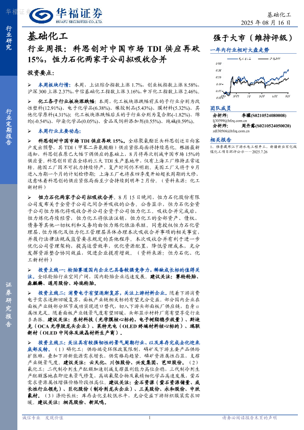 【华福证券】【20250816】科思创对中国市场TDI供应再砍15%-恒力石化两家子公司拟吸收合并-21页
