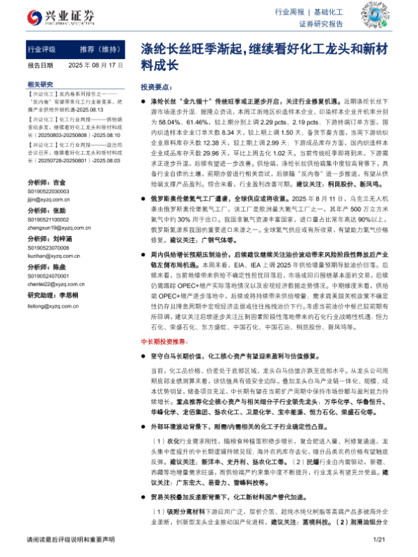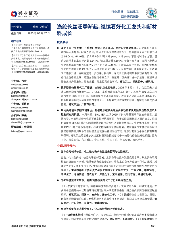 【兴业证券】【20250817】涤纶长丝旺季渐起,继续看好化工龙头和新材料成长-21页