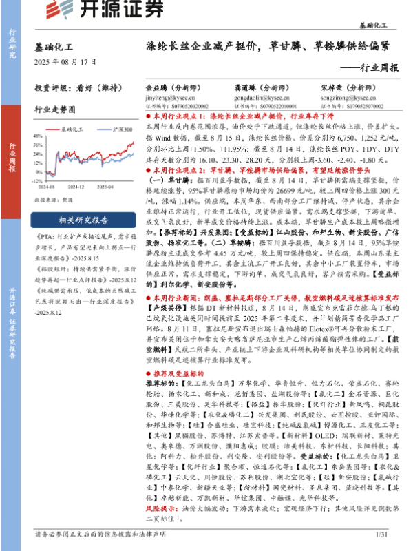 【开源证券】【20250817】涤纶长丝企业减产挺价,草甘膦、草铵膦供给偏紧-31页