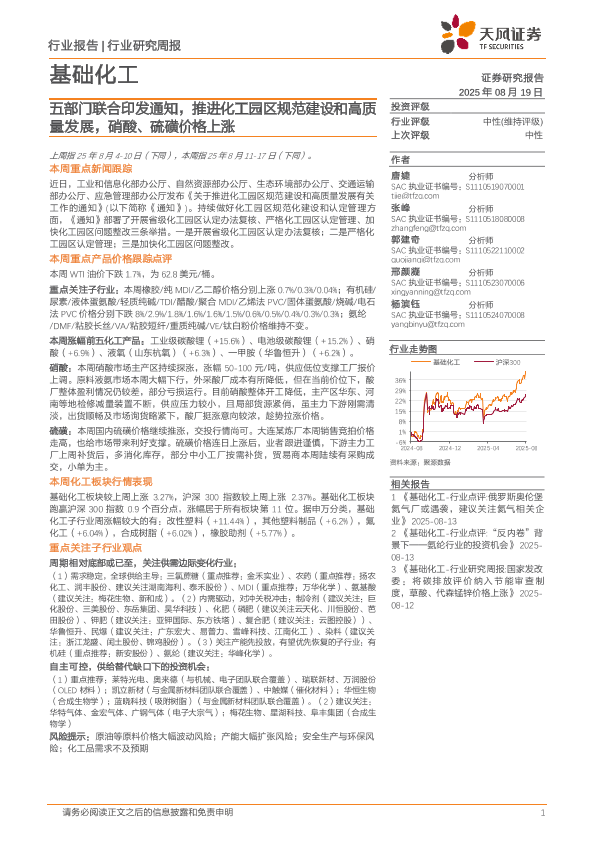 【天风证券】【20250819】基础化工行业研究周报-五部门联合印发通知,推进化工园区规范建设和高质量发展,硝酸、硫磺价格上涨-21页