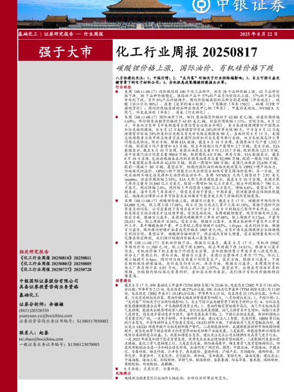【中银证券】【20250822】化工行业周报:碳酸锂价格上涨,国际油价、有机硅价格下跌-14页