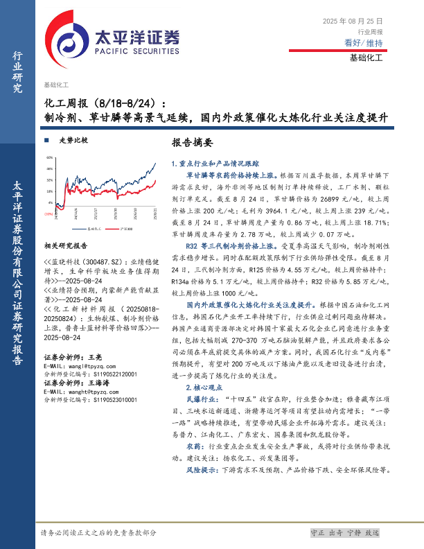 【太平洋证券股份有限公司证券研究报告】【20250825】制冷剂、草甘膦等高景气延续,国内外政策催化大炼化行业关注度提升-34页