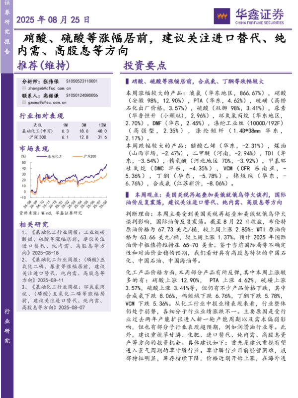【华鑫证券】【20250825】硝酸、硫酸等涨幅居前,建议关注进口替代、纯内需、高股息等方向-32页