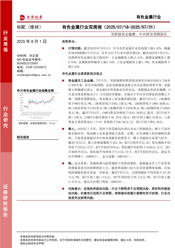 【东菱证券】【20250801】有色金属行业双周报:美联储表态偏鹰,年内降息预期弱化-13页