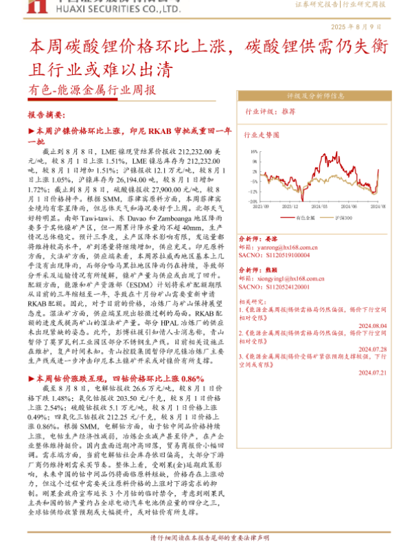 【华西证券】【20250809】本周碳酸锂价格环比上涨,碳酸锂供需仍失衡且行业或难以出清-23页