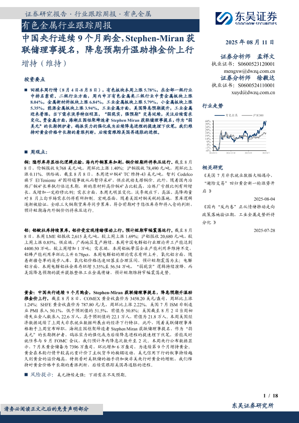 【东吴证券】【20250811】中国央行连续9个月购金,Stephen-Miran获联储理事提名,降息预期升温助推金价上行-18页