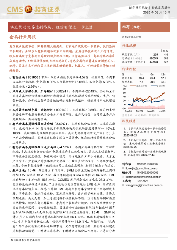 【海通证券】【20250810】金属行业周报-供应扰动改善过剩格局,锂价有望进一步上涨-16页