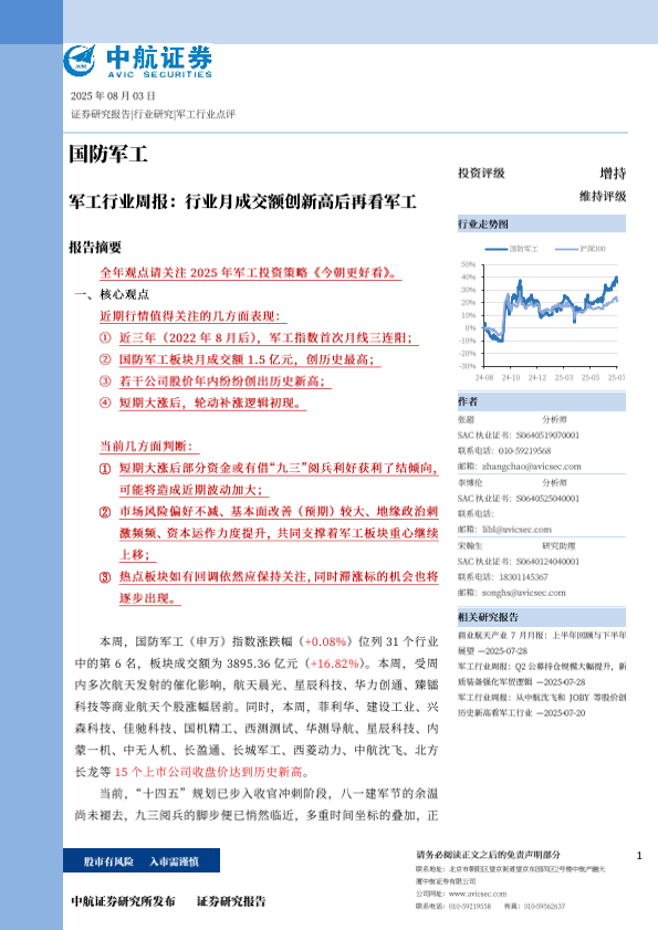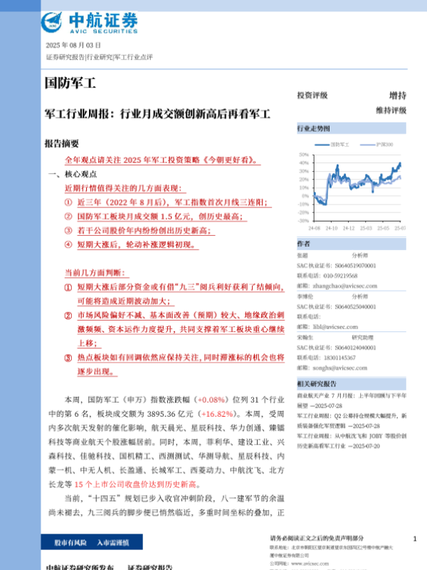 【中航证券研究所发布】【202508】军工行业周报 行业月成交额创新高后再看军工-42页