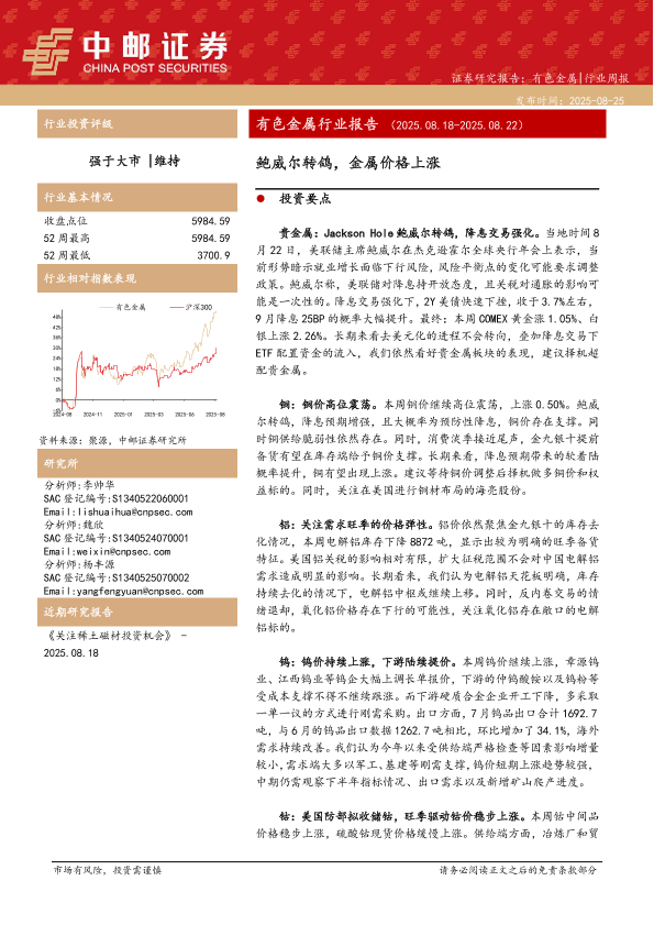 【中邮证券】【20250825】有色金属行业周报:鲍威尔转鸽,金属价格上涨-12页