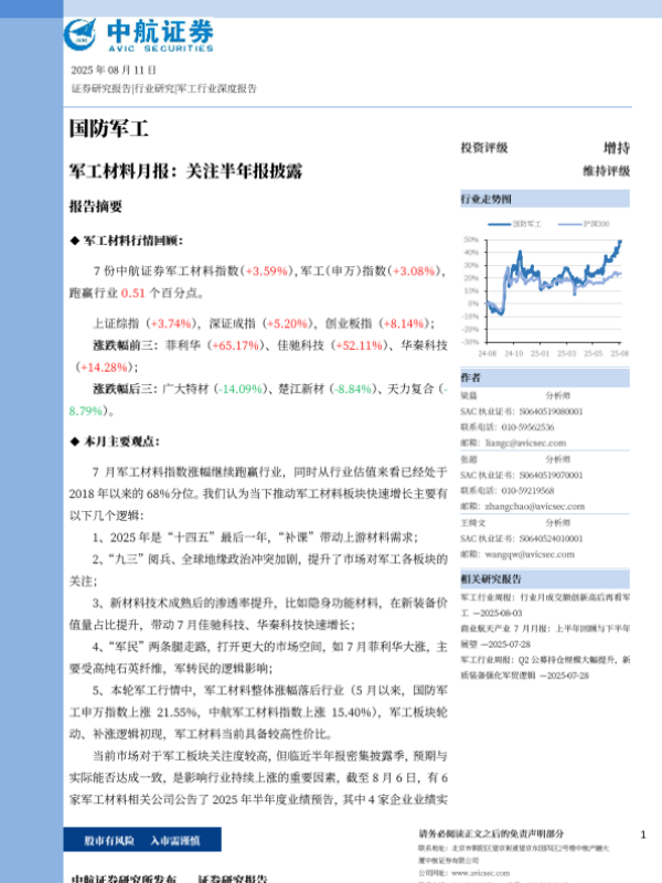 【中航证券研究所发布】【202508】军工材料月报 关注半年报披露-16页