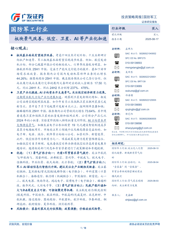 【广发证券】【20250817】国防军工行业投资策略周报:板块景气改善,低空、卫星、AI等产业化加速-18页
