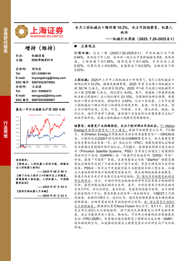 【上海证券】【20250807】6月工程机械出口额同增10.2%,关注可控核聚变、机器人板块-15页