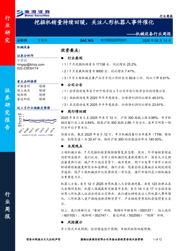 【渤海证券】【20250813】挖掘机销量持续回暖,关注人形机器人事件催化-12页