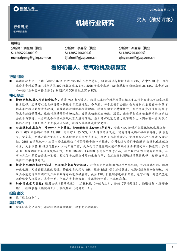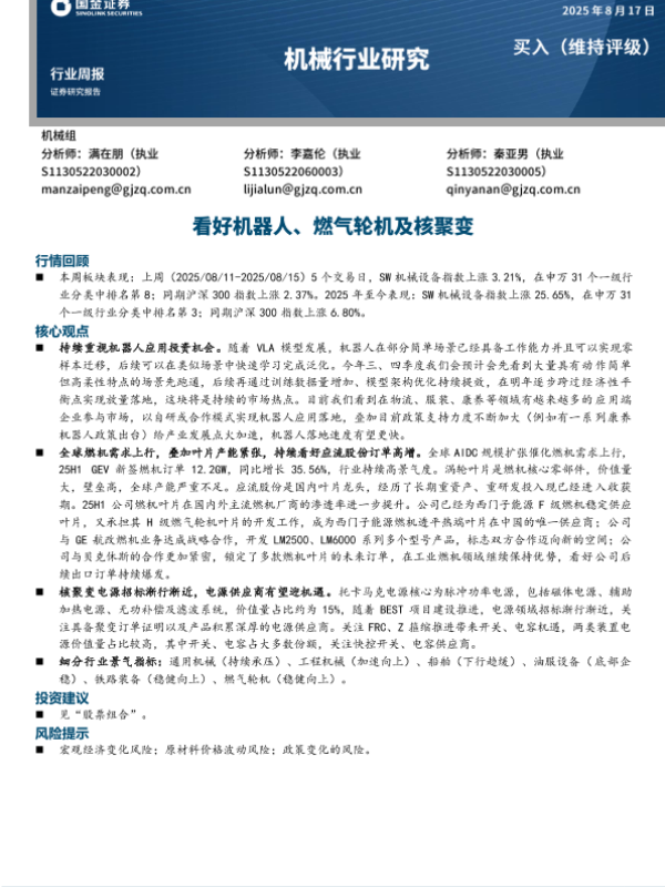 核聚变 机械行业 机器人 燃气轮机 投资建议