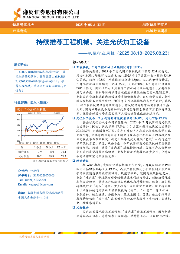 【湘财证券】【20250823】工程机械-持续推荐工程机械,关注光伏加工设备-15页