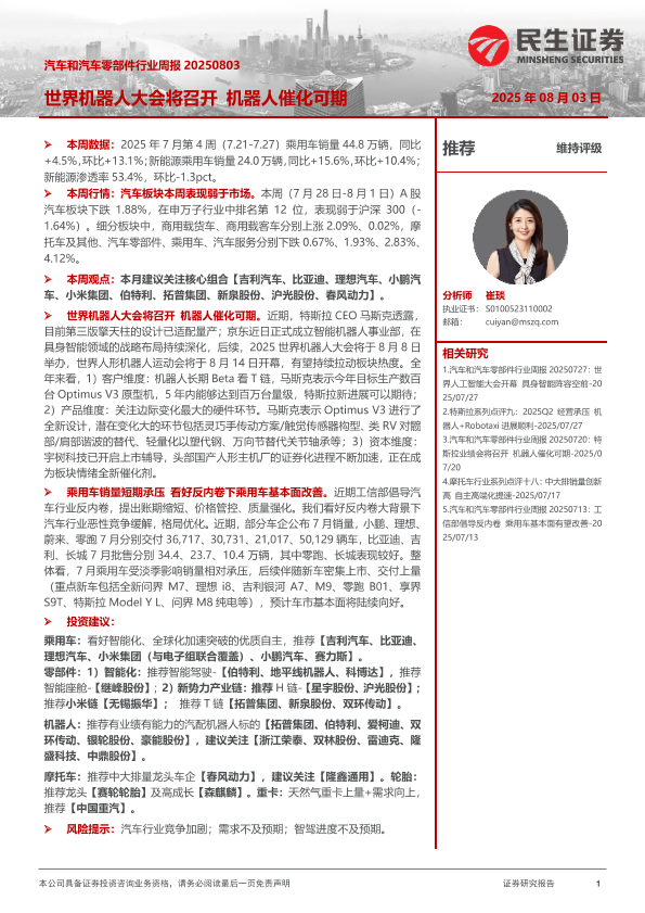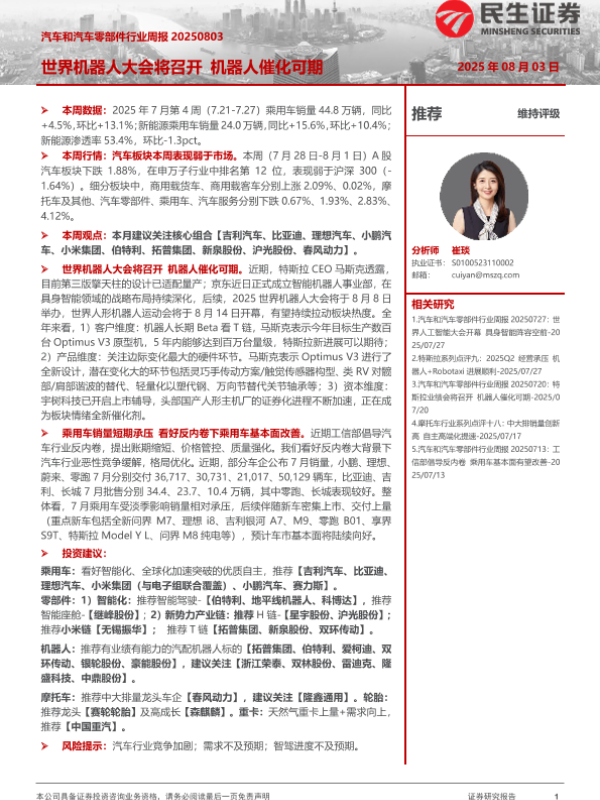 【民生证券】【20250803】汽车和汽车零部件行业周报:世界机器人大会将召开-机器人催化可期-28页