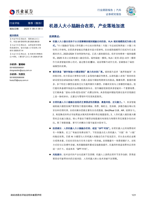 【兴业证券】【20250809】汽车行业跟踪报告:机器人大小脑融合在即,产业落地加速-21页