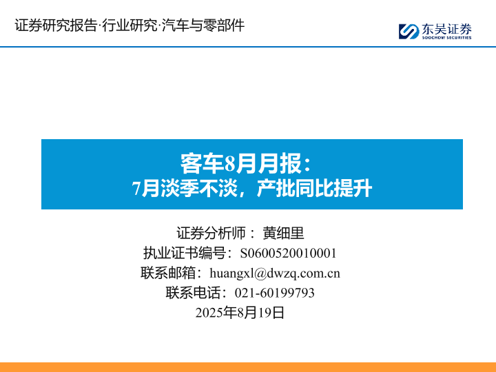 【东吴证券SOOCHOW SECURITIES】【20250819】宇通+金龙-客车8月月报:7月淡季不淡,产批同比提升-17页