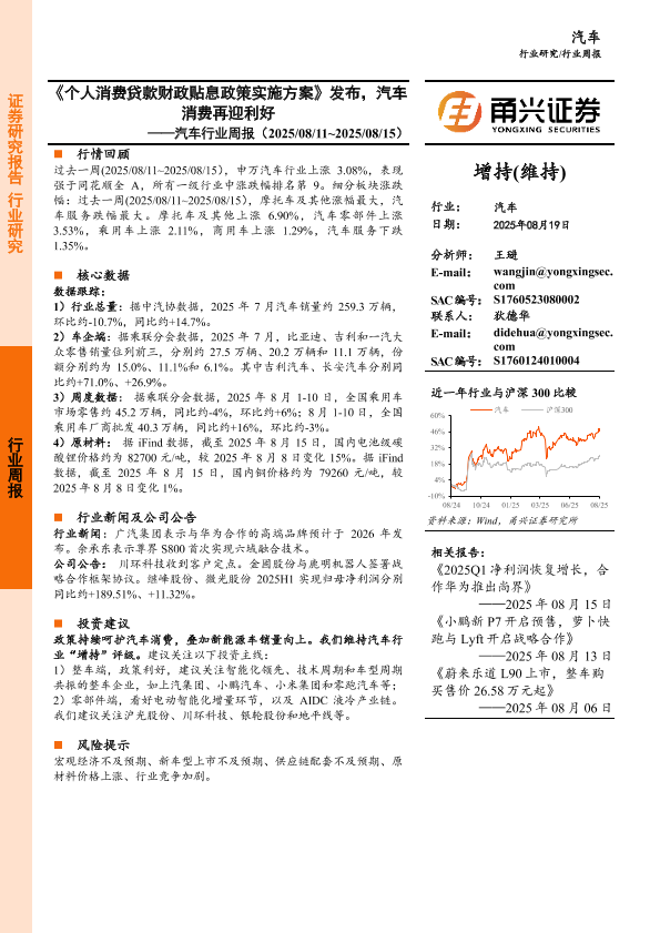 【汽车行业周报】【20250819】汽车-《个人消费贷款财政贴息政策实施方案》发布,汽车消费再迎利好-12页