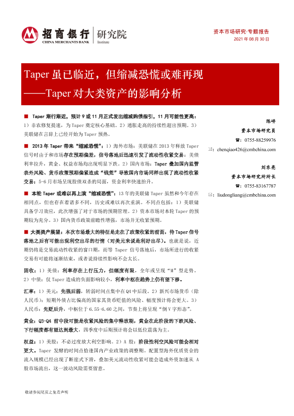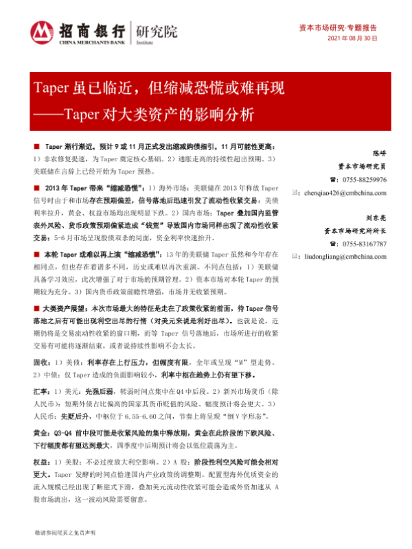 【招商银行】【20210830】Taper虽已临近,但缩减恐慌或难再现 ——Taper对大类资产的影响分析-15页