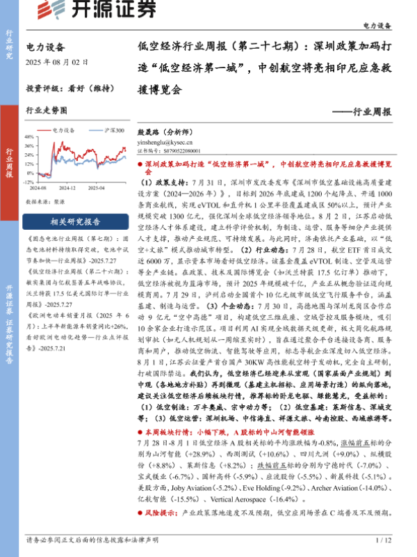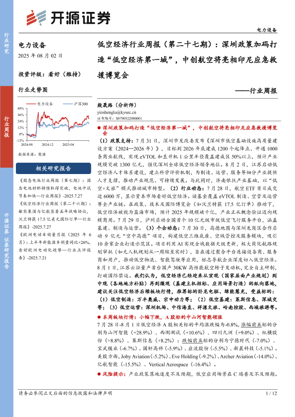 【开源证券】【20250802】低空经济行业周报(第二十七期):深圳政策加码打造“低空经济第一城”-中创航空将亮相印尼应急救援博览会-12页