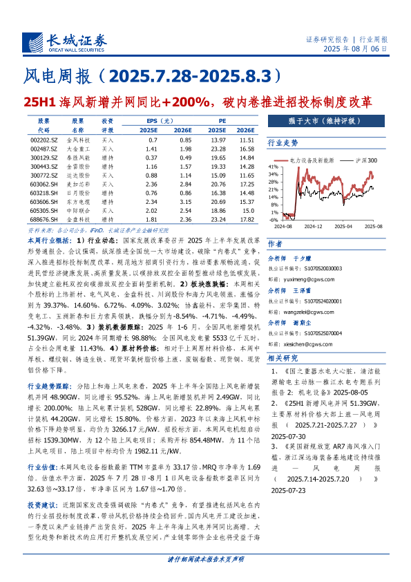 【长城证券】【20250806】风电行业周报:25H1海风新增并网同比+200%-破内卷推进招投标制度改革-13页