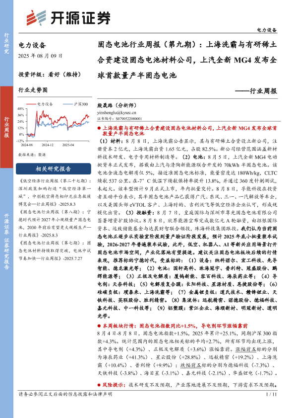 【开源证券】【20250809】上汽-MG4发布全球首款量产半固态电池-固态电池行业周报(第九期)-11页