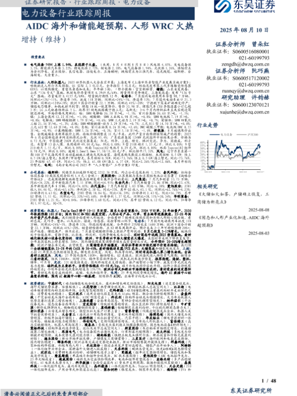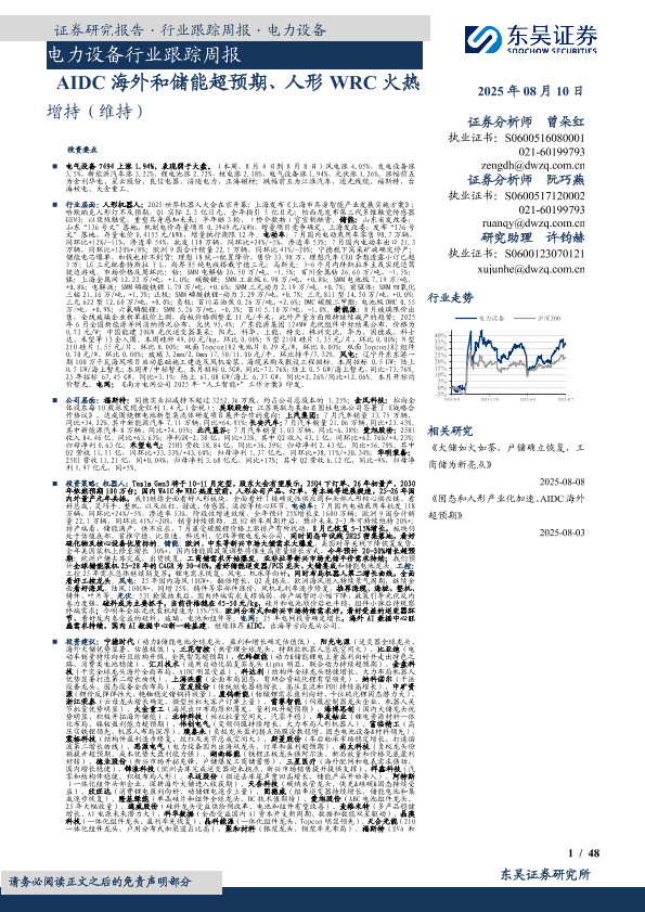 【东吴证券】【20250810】电力设备行业跟踪周报-AIDC海外和储能超预期、人形WRC火热-48页