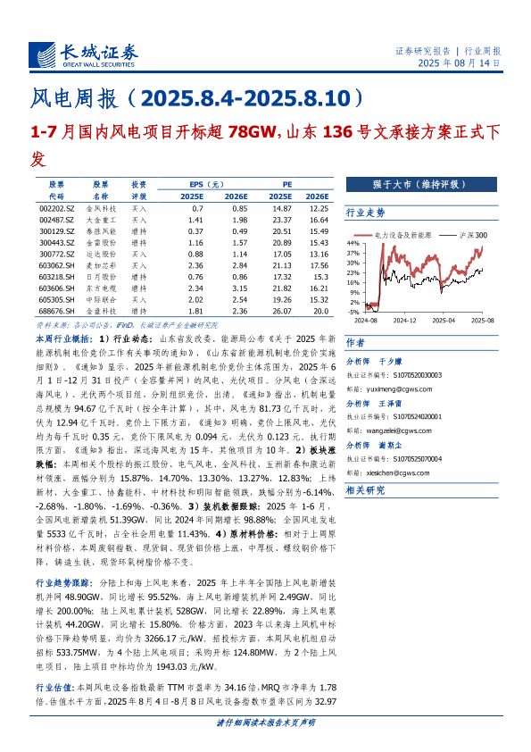 【长城证券】【20250814】风电行业周报-1-7月国内风电项目开标超78GW,山东136号文承接方案正式下发-13页