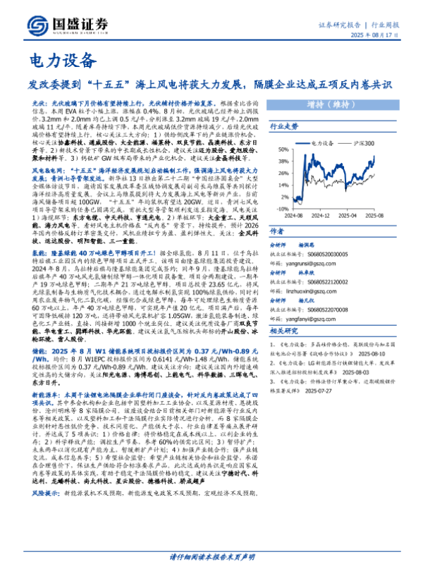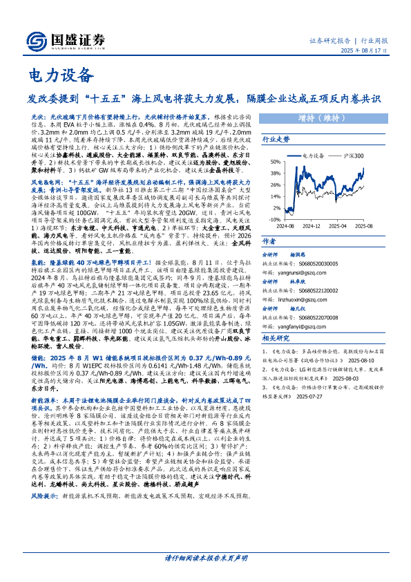 【国盛证券】【20250817】电力设备行业周报:发改委提到“十五五”海上风电将获大力发展-隔膜企业达成五项反内卷共识-13页