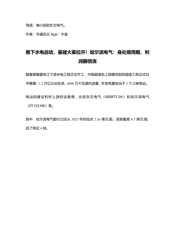 电力设备 清洁能源 水电基建 业绩增长 哈尔滨电气