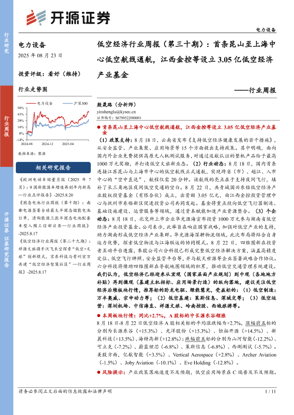 【开源证券】【20250823】低空经济行业周报(第三十期):首条昆山至上海中心低空航线通航-江西金控等设立3.05亿低空经济产业基金-11页