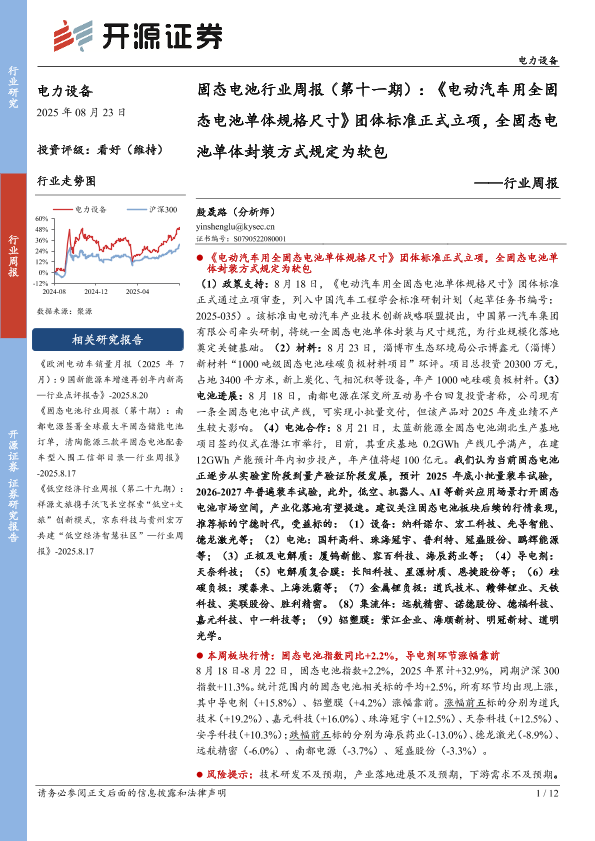 【开源证券】【20250823】固态电池行业周报(第十一期):《电动汽车用全固态电池单体规格尺寸》团体标准正式立项,全固态电池单体封装方式规定为软包-12页