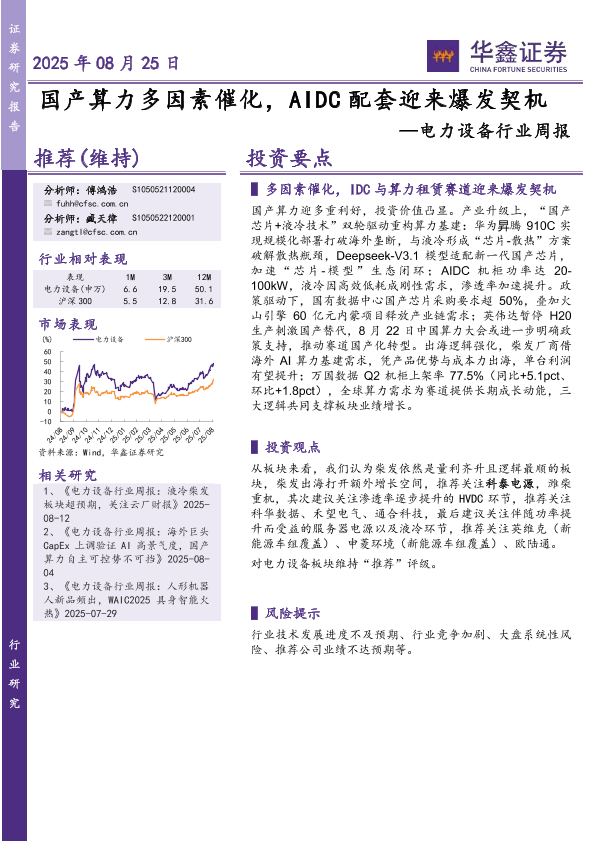 【华鑫证券】【20250825】电力设备行业周报:国产算力多因素催化,AIDC配套迎来爆发契机-18页
