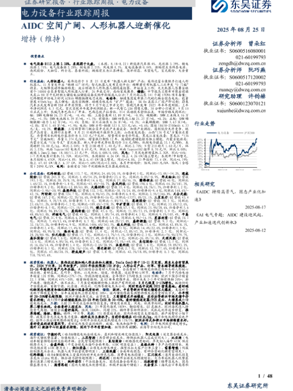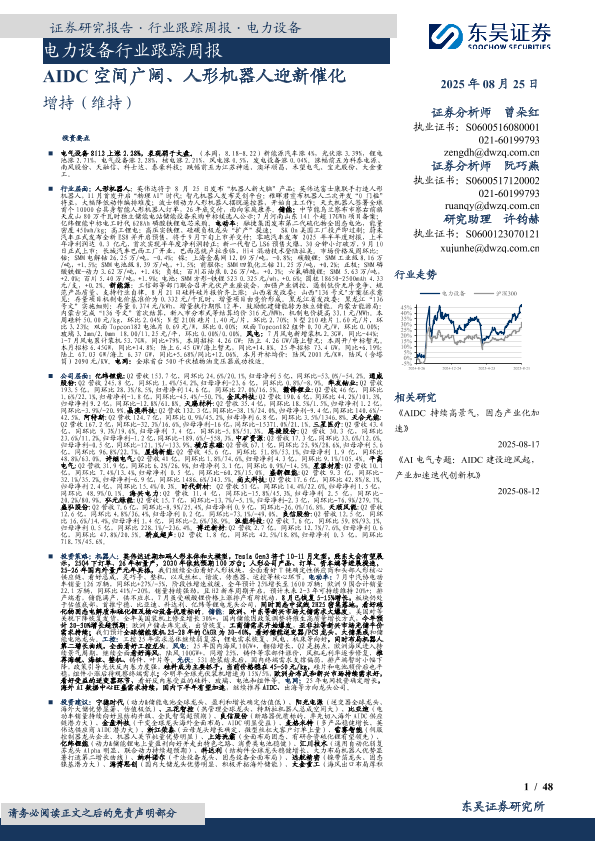 【东吴证券】【20250825】电力设备行业跟踪周报-AIDC空间广阔、人形机器人迎新催化-48页