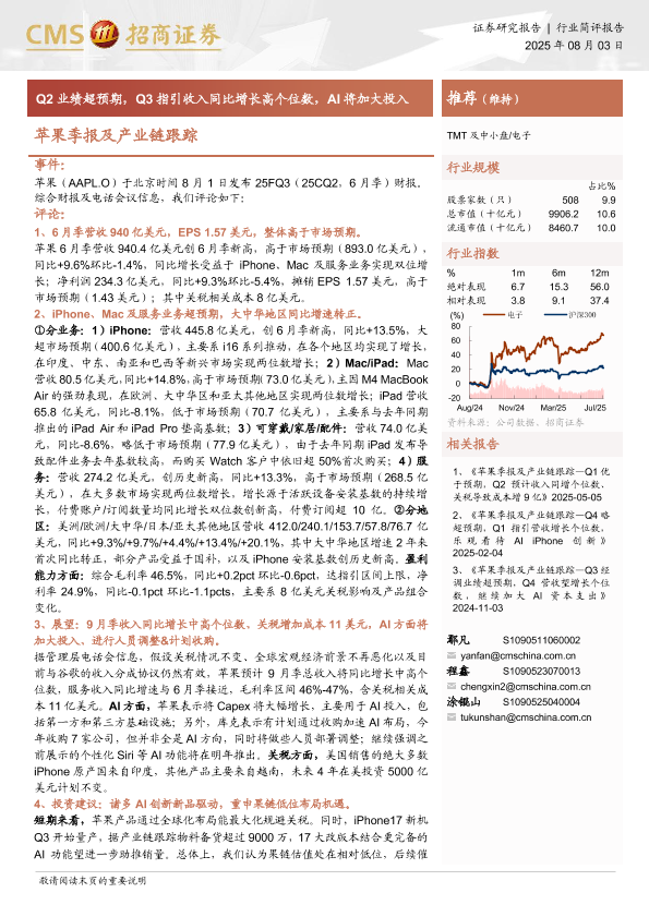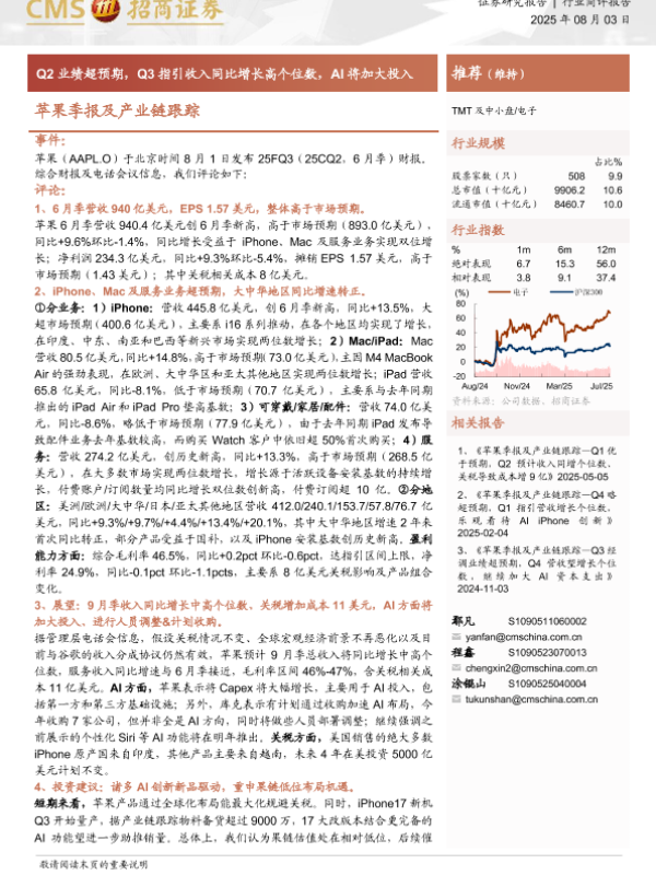 【苹果】【20250803】苹果-苹果季报及产业链跟踪-Q2业绩超预期,Q3指引收入同比增长高个位数,AI将加大投入-13页