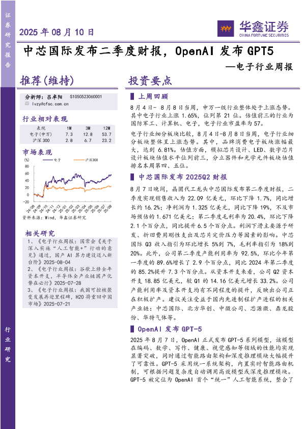 【华鑫证券】【20250810】中芯国际-电子行业周报:中芯国际发布二季度财报-OpenAI发布GPT5-32页